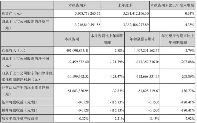 第三季度公司实现营业收入4.92亿元,同比增长2.88%;归属于上市公司股东的净利润亏损945.99万元,同比下降121.39%。