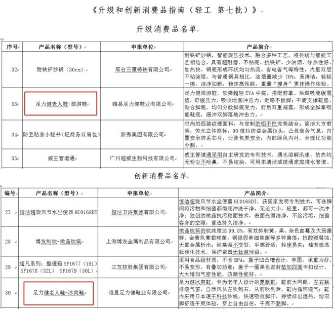 足力健老人鞋冰爽鞋入选创新消费品名单,发布的49款创新消费品均采用了新材料或是新技术,富有独特的创新点,代表了行业前沿发展趋势。
