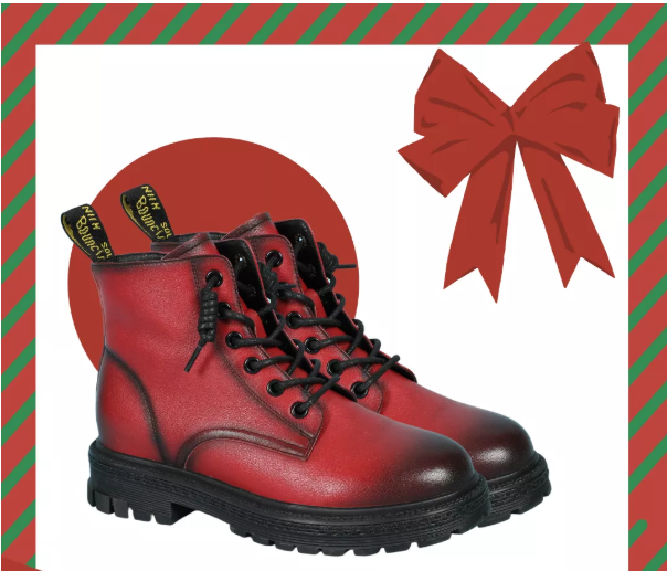才发现红色的也能那么带感,暗红色缓和视觉,鞋面打蜡擦色处理效果,这款时尚复古的马丁靴,让整个圣诞LOOK有种鬼马个性的时尚感。