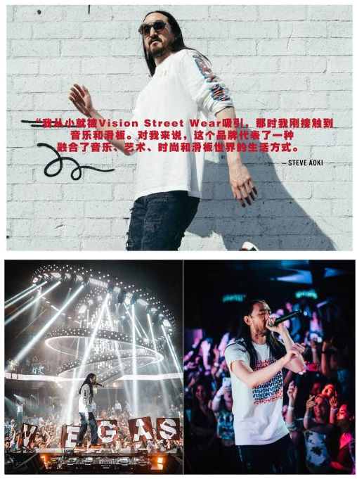 众所周知,Steve Aoki(史蒂夫·青木)因个人前卫的时尚品味被誉为“潮爷”,同时也因超人的音乐天赋在19岁时便创建独立厂牌-Dim Mak。标志性的长发和络腮胡,以及独到的EDM Style -人海浮艇、喷香槟、砸蛋糕,让Steve Aoki的人气居高不下,连续多年荣获得百大DJ称号。更值得一提的是,热衷于街头文化的他也在2017年加入VISION STREET WEAR大家庭,成为品牌合伙人。