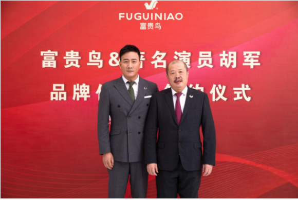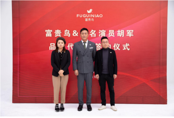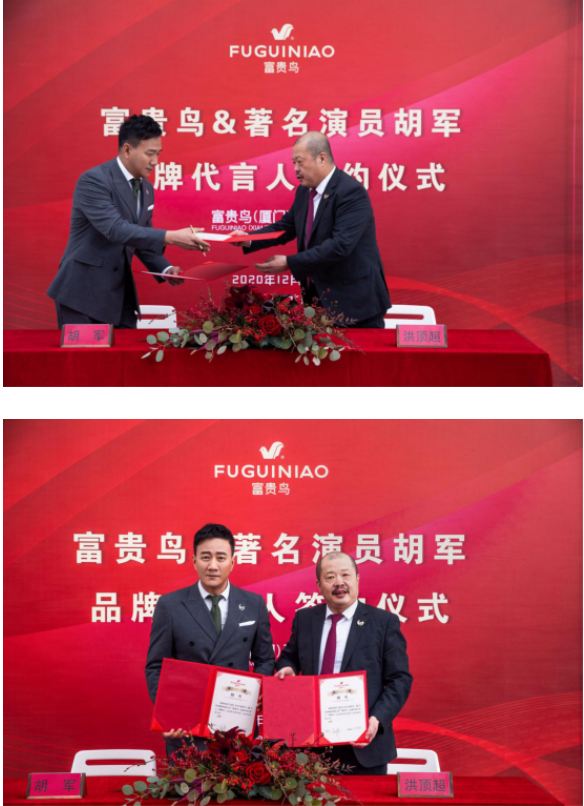 12月22日,品牌在北京成功举办品牌形象代言人签约仪式,富贵鸟集团董事长洪顶超先生、富贵鸟集团副总裁洪钰容女士、富贵鸟集团副总裁钟炳灶先生、厦门媒管家文化科技有限公司创始人兼CEO王双奇先生以及著名演员胡军先生共同出席签约仪式。富贵鸟集团董事长洪顶超先生代表品牌与著名影视明星胡军先生正式签约,正式宣布胡军成为富贵鸟全新品牌代言人。