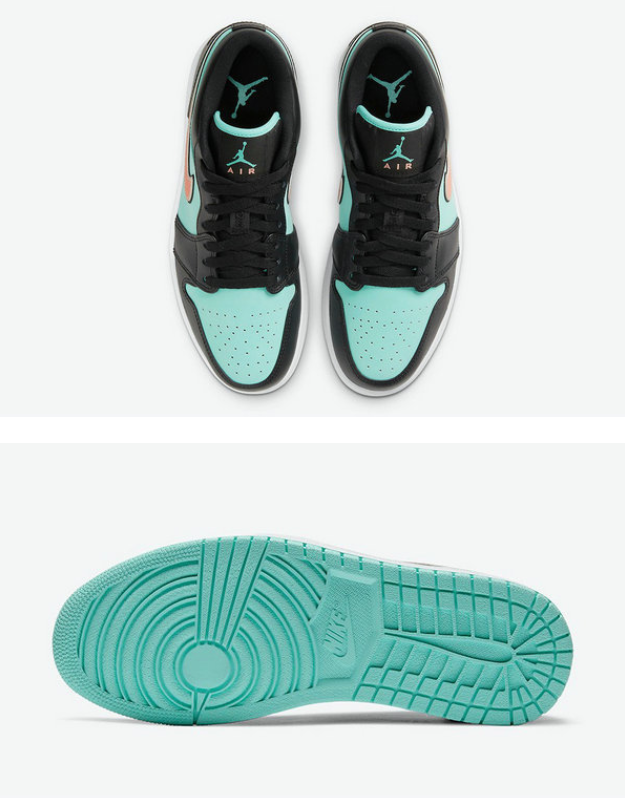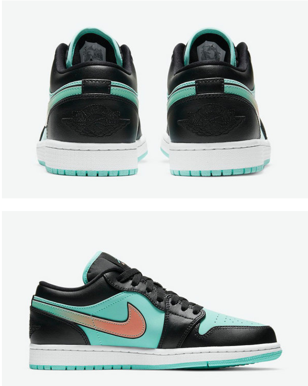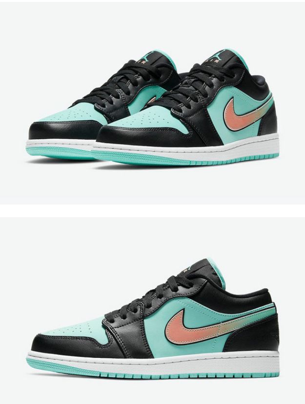 此番美乐淘潮牌汇了解到,从图上看,这双名为“Tropical Twist”的 AJ1 Low 鞋履由黑/松石绿两色拼接呈现,而鞋侧的 Swoosh logo 则是渐变色调的热带风情橙白呈现,颜值不俗,清爽又不失活力!