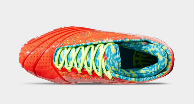 从美乐淘潮牌汇获悉的图片来看,鞋款以亮橙色漆皮为主体,搭配蓝黄两色的喷溅效果,内靴也以相同颜色与之呼应。
