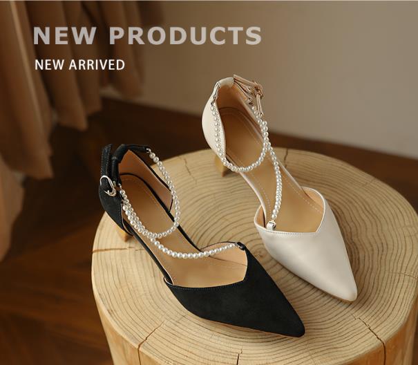 这款鞋子真的很容易给人一种眼前一亮的感觉,这种高跟鞋从里到外都散发着一种成熟的感觉,似乎穿上之后就会立马提高整个人的气质,两种颜色供人选择,想要干净清新感觉的就可以选择这款米白色,想要成熟妩媚的就可以选择黑色。鞋子用两串珍珠来搭配,一方面是作为固定用途,另一方面也是恰到好处的搭配,简直是一举两得也不会显得很累赘,穿上之后很容易修饰脚型,还是非常受市面欢迎的。