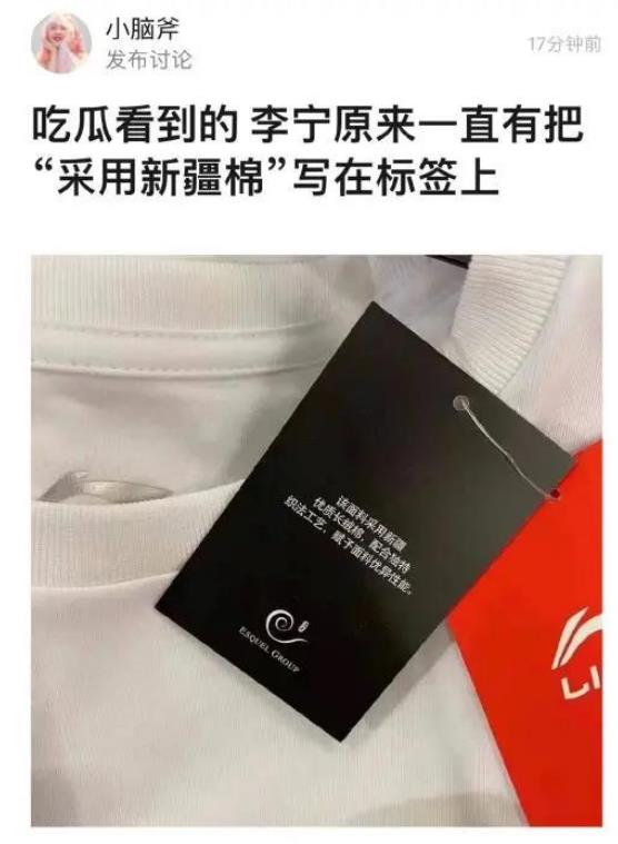 与此同时,有消费者发现,中国品牌此前就将“采用新疆棉”写在了产品标牌上,引发网友一片赞赏。据不完全统计,已有10余中国品牌在官微发声支持新疆棉花(产品),包括安踏、鸿星尔克、361度、特步等。