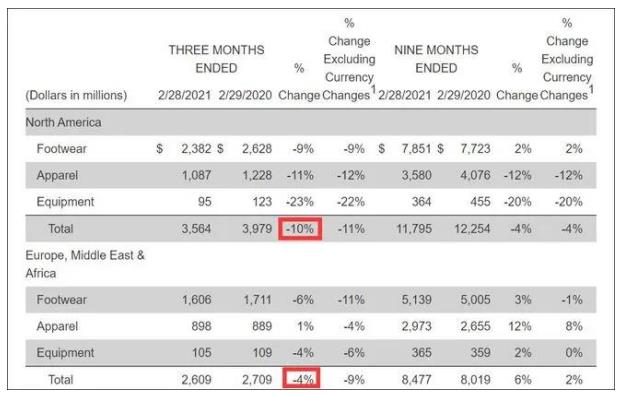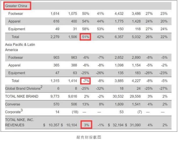 值得注意的是,3月18日,耐克刚刚披露2021财年第三财季业绩,由于新冠疫情蔓延,该公司在全球大部分地区的营收均出现下滑,只有在大中华区实现增长且高达51%,帮助其总营收保持正值3%。事实上,中国市场对耐克营收的贡献不仅体现在单一财季。2019/2020财年该公司在大中华区的销售额上涨8%,连续第六年实现增长。
