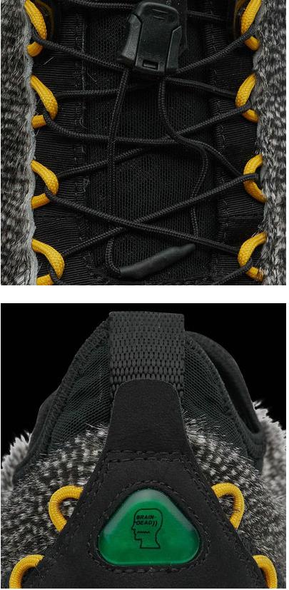 鞋面采用大面积的黑白动物毛发,在鞋头及后跟处更有 ROA 及 Brain Dead Logo 加持,彰显联名身份,使鞋款营造出不俗的层次感,手法大胆的同时也保持了整体的协调。