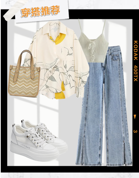 淡黄印花衬衫与淡蓝阔腿裤
