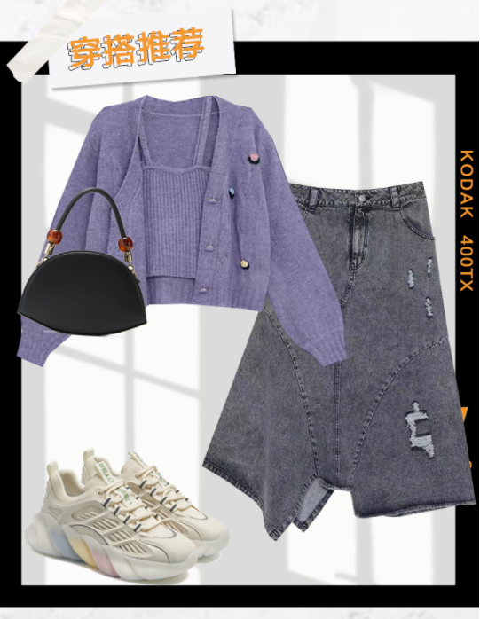 紫色针织与拼接牛仔裙