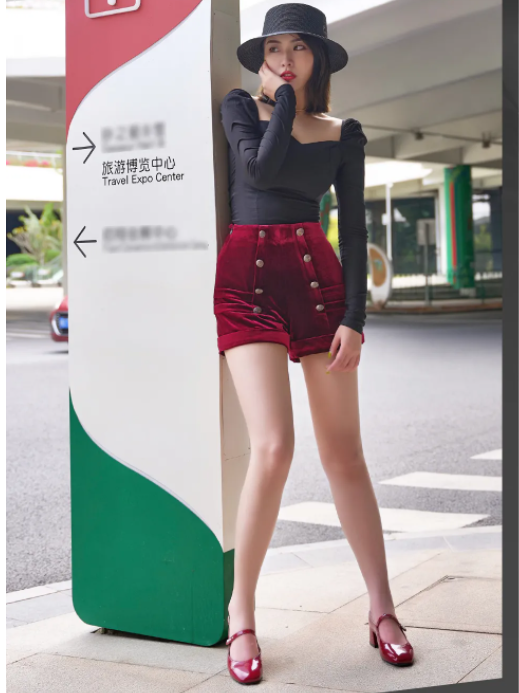 奢华感红丝绒百慕裤配搭黑色编织帽