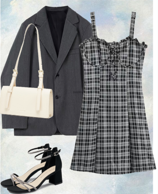 格纹吊带搭配小西装外套
