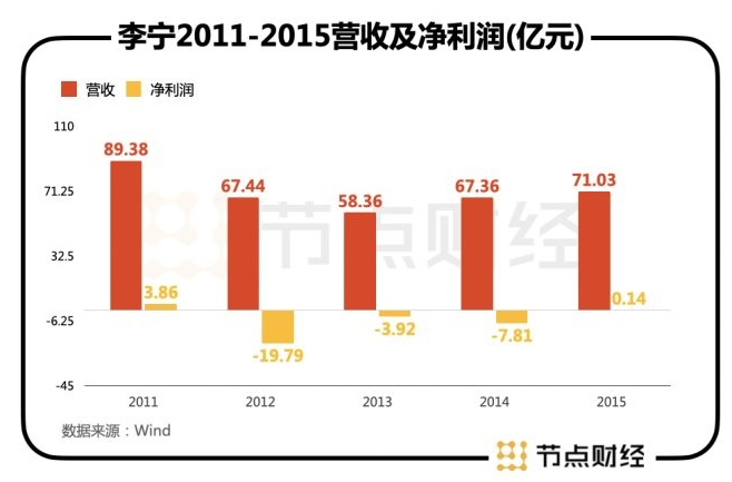 2011-2014年,李宁进入了长达4年的下滑期,营收分别为89.38亿、67.44亿、58.36亿、67.36亿,净利润分别为3.86亿、-19.79亿、-3.92亿、-7.81亿。要知道,在2010年,李宁营收曾逼近100亿大关,净利润11.08亿。