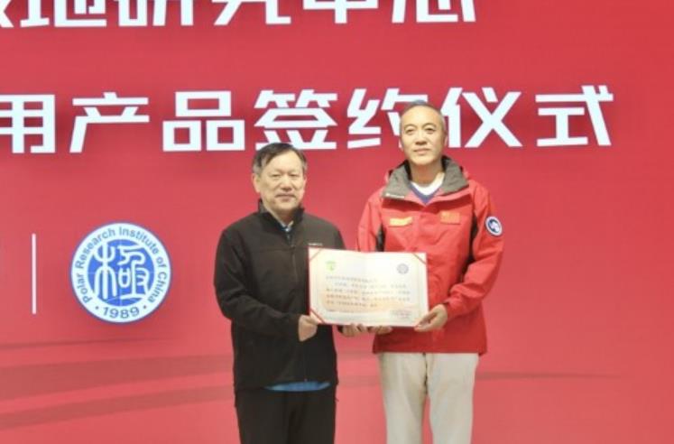 陈楠主任代表极地中心向探路者集团颁发了“中国南北极考察选用产品”牌匾。随后陈旭和赵延平船长互换了礼物,陈旭将一件探路者2021年最新推出的极地复刻限量版防寒服送给了赵船长,赵船长则将雪龙号船模回赠给了陈旭。