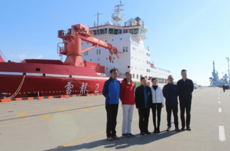 △李明董事长(左三)、陈旭(右一)和陈楠主任(左二)在雪龙2号极地考察船前合影留念