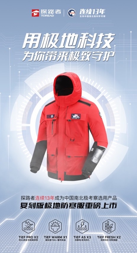 在与中国极地研究中心合作的十多年里,探路者收集并分析了极地考察队员的各项需求,把专业极地工作服所运用到的高新科技融入日常户外装备开发中。在中国第38次南极考察队出征之际,为致敬所有对中国南(北)极考察做出贡献的科考人,探路者发布了全球限量2000件的复刻版极地防寒服。该复刻版不仅还原了探路者为中国南极考察队研发定制的极地工作服众多外观细节,更升级优化了其中的科技含量,加入了TiEF PRO X2防水科技、TiEF AS X3耐久型抗静电科技和TiEF FRESH X2清新科技等众多实用性户外科技,让广大消费者也能体验到专业极地科技带来的安全感与舒适性。