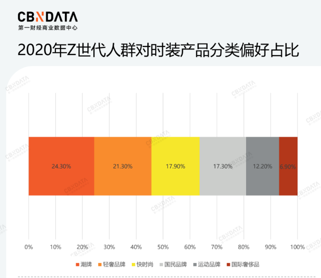 根据新浪微博和前瞻研究院的调查数据显示,Z世代人群对时装产品细分品类偏好排名前五的分别是潮牌、轻奢品牌、快时尚、国民品牌以及运动品牌,快时尚仅占比17.9%。