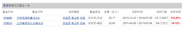2013年7月加入交银施罗德基金,离职前是公司的权益部副总经理,以及首席基金经理。其管理的交银稳健配置,在4年任职期间,实现了112.25%的回报。(见下图)