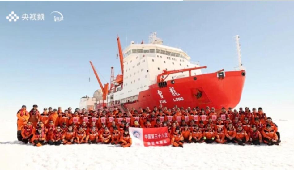 中国第三十八次南极考察队在雪龙号前合影(图片源自央视频直播)