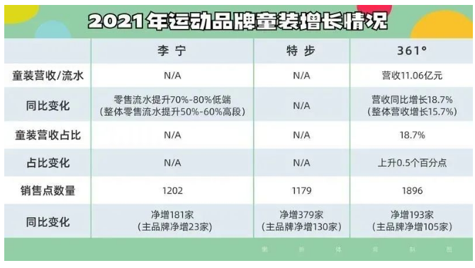 据了解,国内4个上市运动品牌,除了安踏在财报中甚少披露童装的数据,2021年,361°的童装营收增长和李宁的童装零售流水增长都超过了整体。特步财报中虽然没有公布具体数据,但童装的同比增长达到50%左右,超过整体的22.5%。
