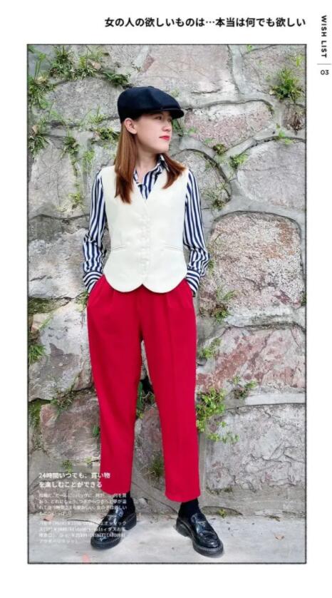 一条红色锥形西裤,跳脱的颜色有点狂野,好在版型是干练的九分裤,能修饰腿部线条的同时也有拉伸比例的效果。