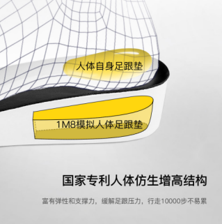 依靠着雄厚的企业实力和先进的科学设备,1M8品牌研发团队通过增加特殊结构和运用高科技材质,研发出模拟人体足跟垫结构的核心产品——“人体仿生足跟垫”,同时也获得了国家实用新型专利和外观专利的认证。借助“人体仿生足跟垫”这一技术成果,1M8专业内增高鞋真正做到了在兼具增高效果的同时,使鞋垫能够充分贴合足弓曲线,给予脚掌全方位的回弹和支撑,加之鞋垫底部特殊置入的特殊圆孔,能够起到减震的作用,释放足部压力,让每一步行走都更加踏实、轻盈。