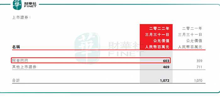 在今年3月底,中国动向投资分部净资产高达84.9亿元,公允价值透过损益列账的金融资产的流动与非流动部分合计达67.25亿元。在投资的股票中,阿里巴巴(09988.HK)是中国动向的“重仓股”,在今年3月底持有阿里巴巴港美股股票的公允价值合共达6.03亿元,持股比例为0.009%。