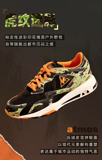 ATMOSatmos作为日本最有代表性的球鞋店铺,虎纹迷彩被奉为经典的原创设计。在本次联名设计中,双方以LCS R888复古城市系列为基础,注入ATMOSatmos标志性印花带来全新虎纹迷彩感官,在经典鞋型上增添户外野性,跳脱出都市沉闷之感,更贴合都市运动风潮。在鞋身材质上,le coq sportif品牌选用反绒皮混拼鞋面,以现代元素解构重塑鞋身,彰显属于城市运动的独特气息。
