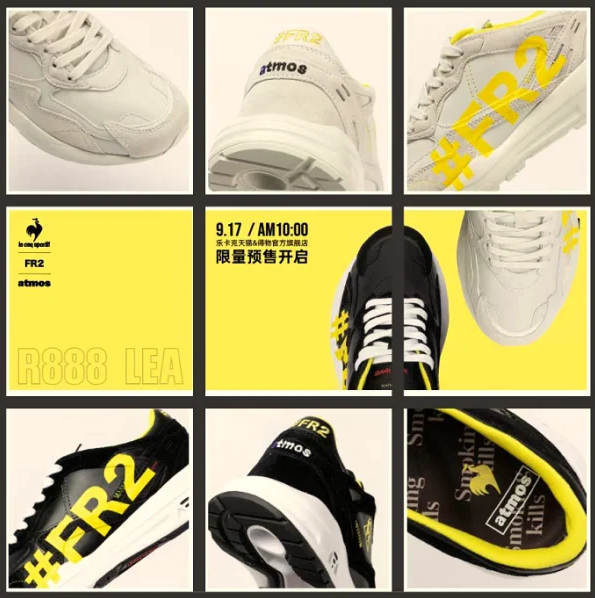 除了ATMOSatmos的标志性印花之外,le coq sportif乐卡克与FR2的联合也别有一番风味。双方此次联名将推出两款配色,在保留LCS R888经典鞋型的同时,将明黄色#FR2字样印于鞋身,吸睛度满分。另一方面,作为日本主流潮流品牌,FR2的兔子形象早已家喻户晓,“兔子与鸡”的创新logo无疑将成为点睛之笔,产生奇妙的化学反应,让这场冒险之旅碰撞出新火花。