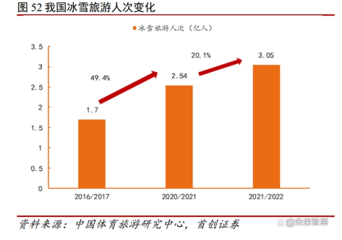 冬奥会带动居民参与冰雪运动热潮。根据国家体育总局《“带动三亿人参与冰雪运 动”统计调查报告》,2015 年北京成功申办冬奥会以来,全国居民参与过冰雪运动的人 数已达到 3.46 亿人,冰雪运动参与率达到 24.56%,实现了“带动三亿人参与冰雪运动” 的目标。冰雪运动的发展同时带动了冰雪旅游市场的高景气,根据中国旅游研究院数 据,全国冰雪休闲旅游人次从 2016-2017 冰雪季的 1.7 亿人次增加 2020-2021 冰雪季 的 2.54 亿人次,预计 2021-2022 冰雪季我国冰雪休闲旅游人数将达到 3.05 亿人次。从 滑雪运动来看,2020/2021 雪季财年的滑雪人次统计为 2076 万人次,较 2019/2020 年度 的 1045 万,同比增长 98.66%;相比 2018/2019 年度增长 0.78%。