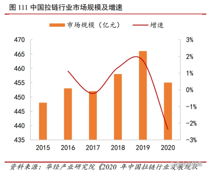 拉链应用领域广泛,占据服装辅料市场的半壁江山。拉链按品种可分为闭尾拉链、 开尾拉链及双开尾拉链;按原材料可分为尼龙拉链,金属拉链及塑钢拉链。尼龙拉链 以聚酯为主材料,成本比较低,是目前市场上最常见的一种拉链;塑钢拉链以共聚甲 醛为主材料,耐用性较金属拉链和尼龙拉链要好,一般常用于防寒服、羽绒服等服装 上;金属拉链是所有拉链中成本最高的一种,一般常用在裤子、夹克、皮衣、皮鞋、 箱包上。根据华经产业研究院数据,2020 年中国拉链市场规模为 455 亿元,则预计我 国拉链市场规模占辅料市场总规模的 48%,依此测算,2021 年中国拉链市场规模约为 533 亿元。若全球拉链占辅料市场总规模的比例与国内相同,则 2021 年全球拉链市场 规模约为 216 亿美元。