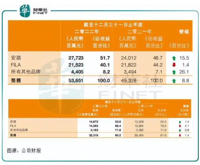 业绩增收不增利的背后,源于一向被视为利润奶牛的FILA品牌首次出现负增长。如下图所示,2022年,FILA 品牌分部实现收入215.23亿元,同比下滑1.4%;期内毛利率由2021年的70.5%下降至66.4%,同比减少4.1个百分点。