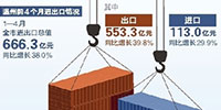 温州网讯记者昨从温州海关了解到,前4个月,全市实现进出口总值666.3亿元,同比增长38.0%。其中,出口553.3亿元,同比增长39.8%;进口113.0亿元,同比增长29.9%;贸易顺差440.3亿元人民币。从单月数据来看,4月,我市进出口总值174.1亿元,同比增长39.4%。其中,出口137.0亿元,同比增长29.6%;进口37.1亿...