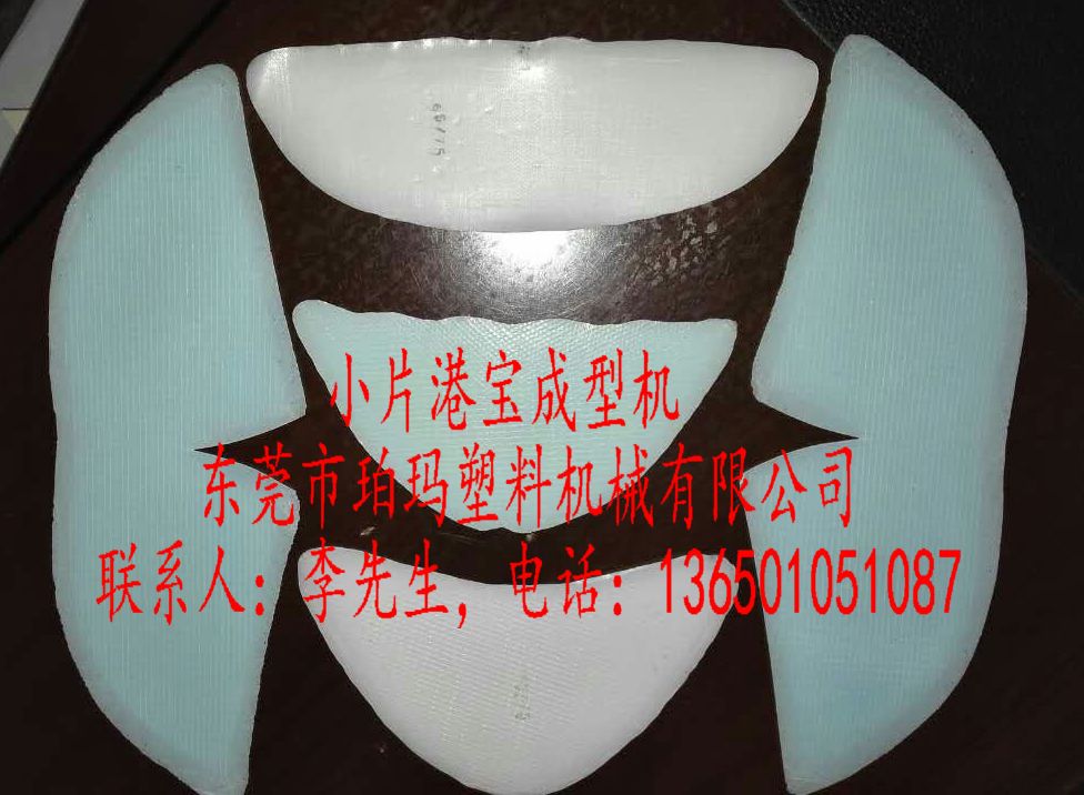 港宝成型机,小片港宝机,港宝小片机,港宝一次成型机,小片港宝成型机,港宝小片成型机 1、传统的鞋材厂,做港宝成双的小片,一般要先用刀模裁好,然后由人工来削边,费时费力,操作繁琐,用工量大,相对管理起来相对麻烦。 2、现在随着鞋材市场对小片港宝需求量的增大,由于人工削边效率低下,传统的做法已大大满足不了市场的需求,珀玛率先研发港宝小片一次成型压边机,先用裁切机先把整张的港宝胶片制品裁切成一双一双的港宝小片,大小尺寸型号根据刀模大小来定,一台小片压边设备需要三个人来操作就可以完成,操作简单,生产效率高,大大提高了生产效率,同时也大大减少了工厂对人工需求。 3、港宝小片压边成型机,生产流程:刀模先裁好小片,再经过压边机加热压边或辊压使小片周边压薄,然后经过冰水冷却,传送到后面缷料,一双一双的周围薄的好像削边的港宝小片就加工出来了。 4、港宝小片压边机有两种做法:1、板式压边机 2、辊式压边机 最大产量:3500-4000双/小时。 东莞市珀玛塑机专业生产港宝机,港宝机器,低温港宝机,片材机,流延膜机,小片港宝压边机,低温热熔胶港宝机,港宝鞋材机,港宝边角废料再生造粒机,片材切断机等 联系人:李生,电话:13650151087 Web: