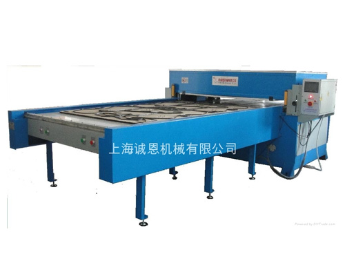 自动分次进退料精密四柱裁断机 机器性能及参数:型号 XCLP3-1000 最大冲切力 1000 KN 冲程调节范围 10~150mm 压板至工作台距离 50~200mm 电机功率 7.5KW 外型尺寸 2350X2300x4500mm 净重 5500Kg 液压系统滤油装置、各运动点自动滴油润滑安全防护装置双手防护/安全光幕/防护隔离罩机械结构自动平衡双连杆机构驱动装置自动送料光电控制技术要求 XCLP3-1000型液压四柱自动送料下料机是引进国外先进技术、自行研制开发生产的大吨位大面积的特殊适合面积特大一次不能完全冲切工件的下料机械。主要适用于皮革、塑料、布类、皮包、玩具、发泡片、橡胶制品、软木片等各种需要用刀模裁剪物,均可适用。 1,双油缸、四柱自动平衡连杆装置,保证每一个裁断位置深度相同。 2、自动送料装置,二次裁切令整机生产效率提高二至三倍。 3,二段式裁断,第一段下降,第二段集中压力,以高压裁断,此法裁断物刀口整齐,增长机械寿命,且节省耗电量。 4,特有刀模设定构造,配合裁断刀及裁断高度,使行程调整简单,准确。 5,中央有自动润滑系统确保机器精度及提高机器耐用度。 6,机箱为油箱增大了油箱体积从而保证长期工作机器油温保持应许范围,保油温不升高。 7,可以双面同时工作,不受冲切材料的厚度,刀模的高度不同的限制
