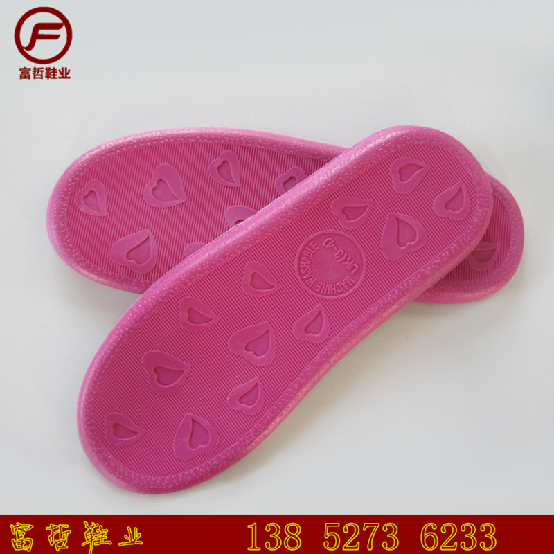 牛筋鞋底 tpr鞋底 EVA鞋底厂家扬州富哲鞋业有限公司坐落于风景秀美的古城——扬州。扬州,地处江苏省中部,南临滔滔的长江,东倚静静的京杭大运河,历来就是风光秀美的风景城、人文荟萃的文化城、博大精深的博物城。 富哲鞋业是集研发,生产,销售于一体的国内鞋业研发中心和生产厂家。有着近20年专业研发及生产经验。公司主营TPR鞋底及EVA鞋底等产品,可来图来样定制各类底纹鞋底。  TPR鞋底、EVA鞋底专业生产厂家——扬州市富哲鞋业有限公司,产品广泛应用于各类男女士拖鞋、棉鞋、居家鞋底的应用。 公司励志成为国内专业的TPR鞋底及EVA鞋底供应商。  公司秉承“为客户供应更好产品”为中心,对企业自身要求以“高效,务实,创新,开拓”聚集批量人才为发展动力,对客户以“诚信,尊重,友好,持续”的市场导向为经营理念。充分尊重员工的劳动成果有效的转化为客户的价值,企业的效益。使得企业进入良性循环发展的快车道,是新老客户使用放心产品的后盾。 “让客户放心,让客户满意”是我们永远的追求,公司依托强大的市场资源优势,服务于广大客户,全力打造市场,不断开发新品,真诚希望与新老客户携手合作,共创未来!联系人:王飞 Q Q:1845846668 电 话:13852736233