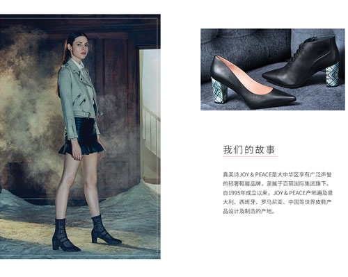 JOY&PEACE,意为“喜悦”“和谐”,源于欧洲“世界不大同”的理念。真美诗将制鞋视为一项孜孜以求的艺术创作,以奢华时尚的欧洲鞋履设计及精湛的意大利制鞋工艺,为追求品质生活的女士顾客缔造与从不同的喜悦与和谐。