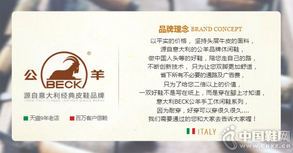 BECK,中文名称“公羊”,是一个意式真皮休闲鞋领先品牌,致力于传承意大利百年制鞋工艺而创立,2006年,BECK公羊(中国)运营中心在中国大陆正式成立,是淘宝网男鞋类目真皮休闲鞋领先品牌之一。BECK公羊以其“不一样的选材及工艺”,致力为顾客提供超凡品质的手工皮鞋,让更多人享受舒适行走带来的快乐。