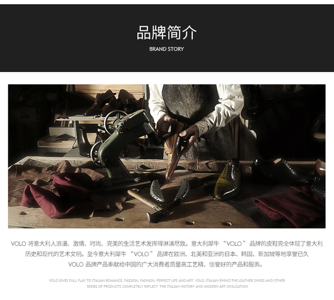 意大利犀牛国际公司继承了世界时尚之都——意大利的所有高贵、典雅、精致的时尚文化和艺术元素,并发挥创新精神,给“VOLO” 犀牛品牌注入现代文明和现代美学的新鲜血液,使得“VOLO” 犀牛品牌时装、皮鞋、皮具等系列产品,充满浪漫、休闲、自然、和平的时尚风采,从而“VOLO” 犀牛品牌一举成为欧洲乃至世界的高档时尚品牌之一。