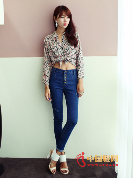 很有女人味的花色印染衬衫,色系丰富饱满,宽松版型,下摆卷到腰腹打结穿,在搭配上高腰修身牛仔裤,秀出完美腰线。