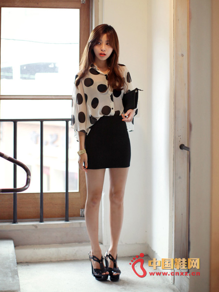 俏皮的大波点配色的斗篷式衬衫,斗篷式的设计,无限宽松,搭配上包臀的半身裙穿,展现出大方利落的职场魅力。
