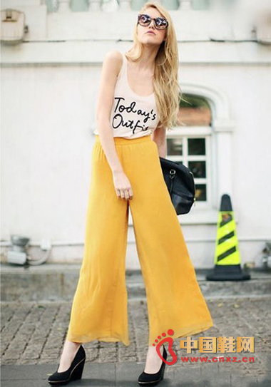 阔腿裤既有长裙的飘逸,又有长裤的帅气,近几年越来越受女孩们的喜爱,雪纺面料的亮色阔腿裤搭配简洁的白色T恤,加强衬托出阔腿裤的高腰效果,再搭配一双同样简洁低调的高跟鞋/坡跟鞋,整个气场立马彰显,就算不是模特的九头身身材,也能穿出秀场上霸气自信的气质。