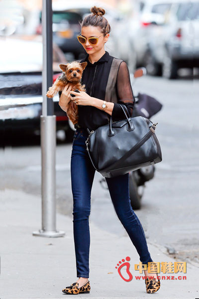 辣妈米兰达·可儿抱着爱狗在街上溜达,穿着黑色薄纱半透衬衫搭配牛仔紧身裤和豹纹,休闲的服饰在黑纱和豹纹的单品展现了性感娇艳,简单的搭配还是掩盖不住女神的魅力。