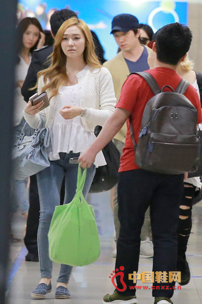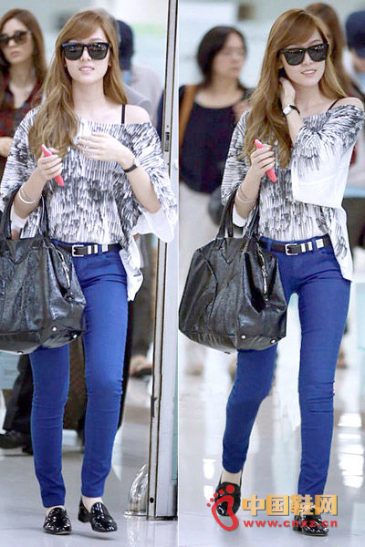 少女时代团员Jessica在日常也爱以搭配平底懒人鞋的搭配,此次上身穿露肩宽松的蝙蝠袖上衣,性感的小露让平淡的搭配多了看头。