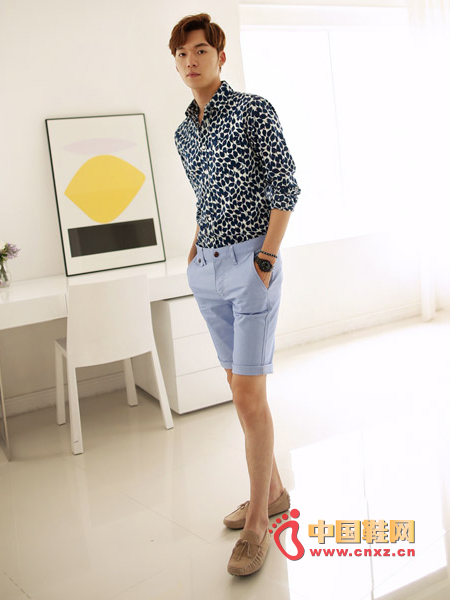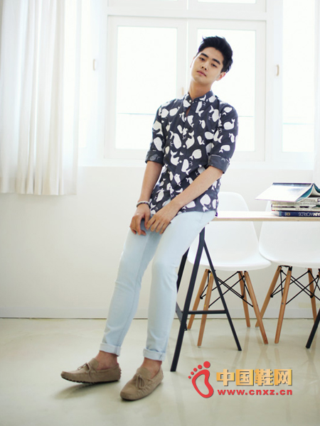 魅力的叶子图案点缀的衬衫,配色也恰到好处,穿着轻便凉爽,简单修身的搭配,展现出摩登风格的装扮。