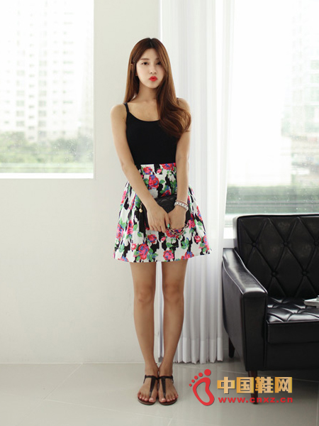 饱满的花朵印花,整体的修身效果不错,大大的印花还有修饰赘肉的视觉效果,字母T和凉拖的搭配穿出休闲舒适的清凉感。