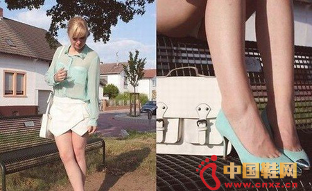 清爽的透视薄荷绿色搭配白色折纸裙裤,清新时尚,搭配金属尖头同色系高跟鞋,拉长腿部线条。