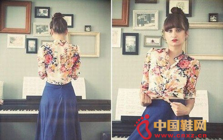 花卉图案的修身小衬衫搭配墨蓝色,复古风十足,垂坠飘逸。将衬衫角打结,更能从视觉上拉长腿部线条,修身显瘦!
