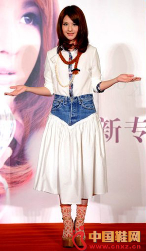 郭静在《我们都能幸福着》的新专辑发片会上,身穿改良式牛仔拼接亮相,外加蕾丝彩色短袜,看上去非常另类独特。