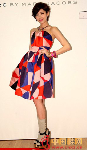 郭雪芙身着Marc by Marc Jacobs几何形拼色抹胸,甜美娇俏露出迷人锁骨。灰色短袜与黑色金边高跟鞋,低调的组合高调秀身姿。