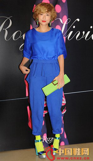 徐濠萦身着蓝色丝绸质地上衣内扎蓝色翻边长裤,脚穿绿色荧光短袜配,再加上荧光色长款手包,“闪瞎”双眼啊!